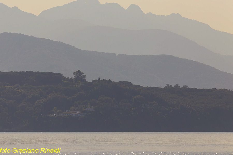 Es sind Teile von diesem Strand von denen aus, da man das offene Meer nicht sehen kann, es scheint, dass man sich am Ufer eines großen Sees befindet, ein wunderbares natürliches Amphitheater aus Hügeln von einem satten Grün geschaffen, die im Osten in der Ebene von „Le Prade“ auslaufen, eine der beiden Küstenfeuchtgebiete der Insel, während im Norden sich das Land und das Meer unter den dunklen Felsenriffs treffen, die von dem eleganten Leuchtturm aus dem siebzehnten Jahrhundert von Portoferraio überragt werden. Im Zentrum der Aussicht, in einer Perspektive, die von hier aus ungewöhnlich und weit zurückliegend erscheint, erhebt sich der elbanische Berg, 1.119 Meter über dem Meer, vorweggenommen von den Profilen der niedrigeren Hügel, die sich zwischen dem Meer und dem Monte Capanne befinden. An Tagen mit schönem Wetter, wenn die Sonne in der gleichen Richtung des Berges untergeht, meißelt sie die Umrisse der Erhebungen ein, als ob es sich um eine neuromantisches Bühnenbild handeln würde.